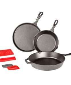 Get everything you need to sizzle, all in one set! This set features two skillets and a griddle, so you can sizzle all of your favorites. Cast iron provides great heat retention, incredible durability, and a naturally seasoned cooking surface that’s ready to go, straight from the foundry. Plus, you’ll get a handle holder, pot holder, and two pan scrapers—each specially designed for cast iron cooking and cleanup.Â
