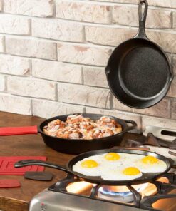 Includes: 10.5 Inch Seasoned Cast Iron Griddle, 10.25 Inch Seasoned Cast Iron Skillet, 8 Inch Seasoned Cast Iron Skillet, Red Silicone Handle Holder, 2 Pan Scrapers, and 6 Inch Square Red Silicone Pot Holder