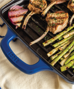 This colorful collection of enameled cast iron is the first of its kind to be made on US soil. Inspired by the best in American design, this piece will help you bring the cookout to your kitchen. It takes everything you love about cast iron, like great heat retention and durability, and combines it with an enameled surface that can withstand acidic ingredients. Grill lovers, unite!